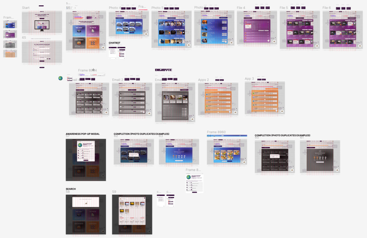 The Design ProcessThe Pivot: We started with separate mobile and email concepts ("Crazy 8s"). However, after I conducted a SWOT analysis, it was revealed neither fully supported habit formation and change we needed to effectively target the problem. We pivoted to a centralized web dashboard to unify the user's entire digital footprint. I also decided to heavily focus on behavioral change research and how it could be incorporated into features for our design.Heuristic Evaluation: Through evaluations, we identified safety risks, leading to the addition of "Deletion Confirmation" steps and other safety features for users.User Testing Strategy: I designed two rounds of testing protocols to iterate on the product. Round 1 focused on general usability, where my findings on low engagement led to the addition of "Impact Milestones." For Round 2, I created specific tasks to stress-test file sorting, uncovering friction points that directly informed the "Smart Search" redesign.Final Validation: We validated the final design using the System Usability Scale (SUS) with 15 participants. Digibyte achieved a score of 78.8, rating it as "Good/Excellent" for usability and learnability.