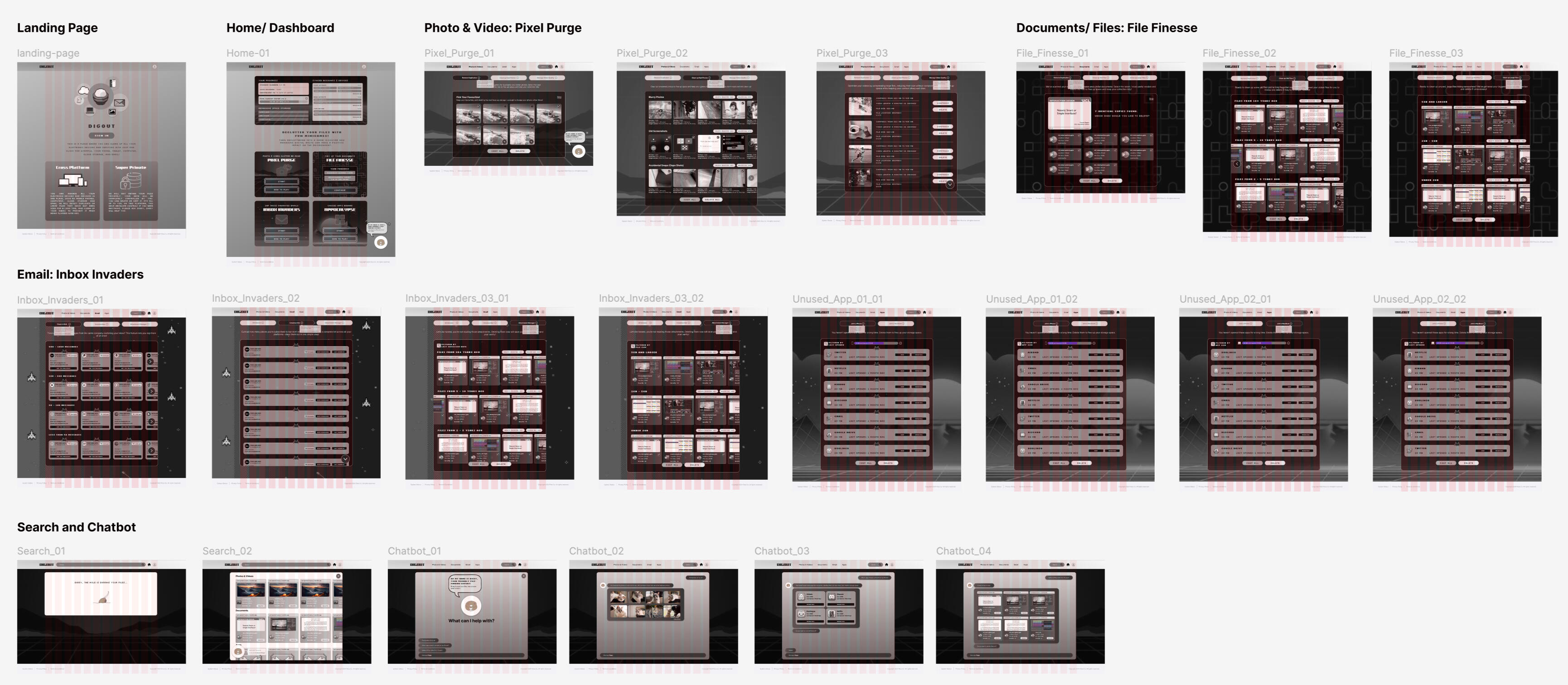 Behavioral Reinforcement: Integrated "Celebration" pop-ups to reward decluttering milestones and reinforce positive habits.Visual Storage Tracking: Files are categorized by type with progress bars that visualize space usage in real-time.Organized File Deletion: Files are easy to delete through the system categorizing and filtering files that are taking up unnecessary space. Users can double-check the selection before simply pressing delete. There are undo options built in for mistakes."Diggy" AI Assistant: A chatbot that automates complex decluttering tasks through simple conversational commands.Gamified Impact: Deleting files unlocks milestones that translate "megabytes saved" into tangible environmental wins, reinforcing positive habits.